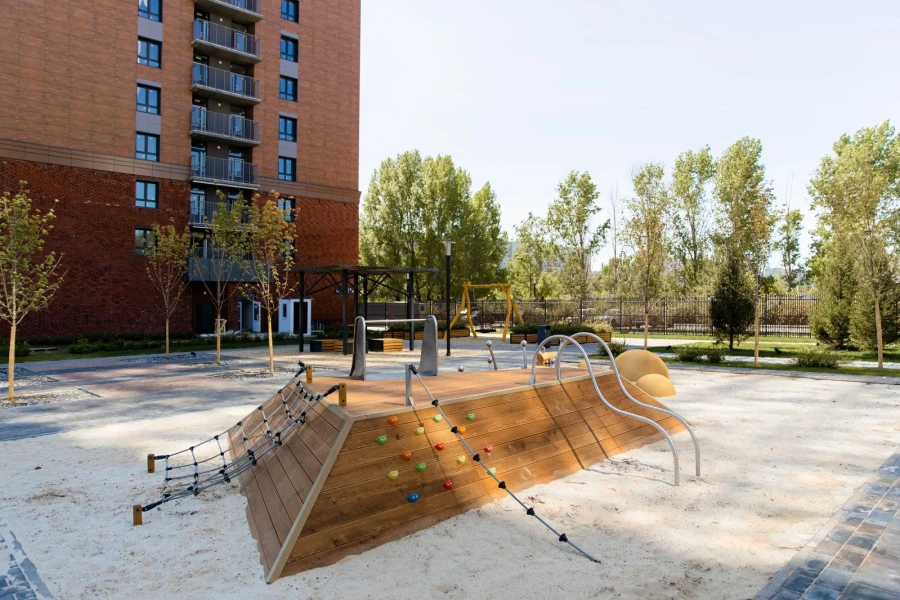 детские и спортивные площадки покрыты специальным прорезиненным материалом, чтобы дети и любители заняться спортом чувствовали себя комфортно;