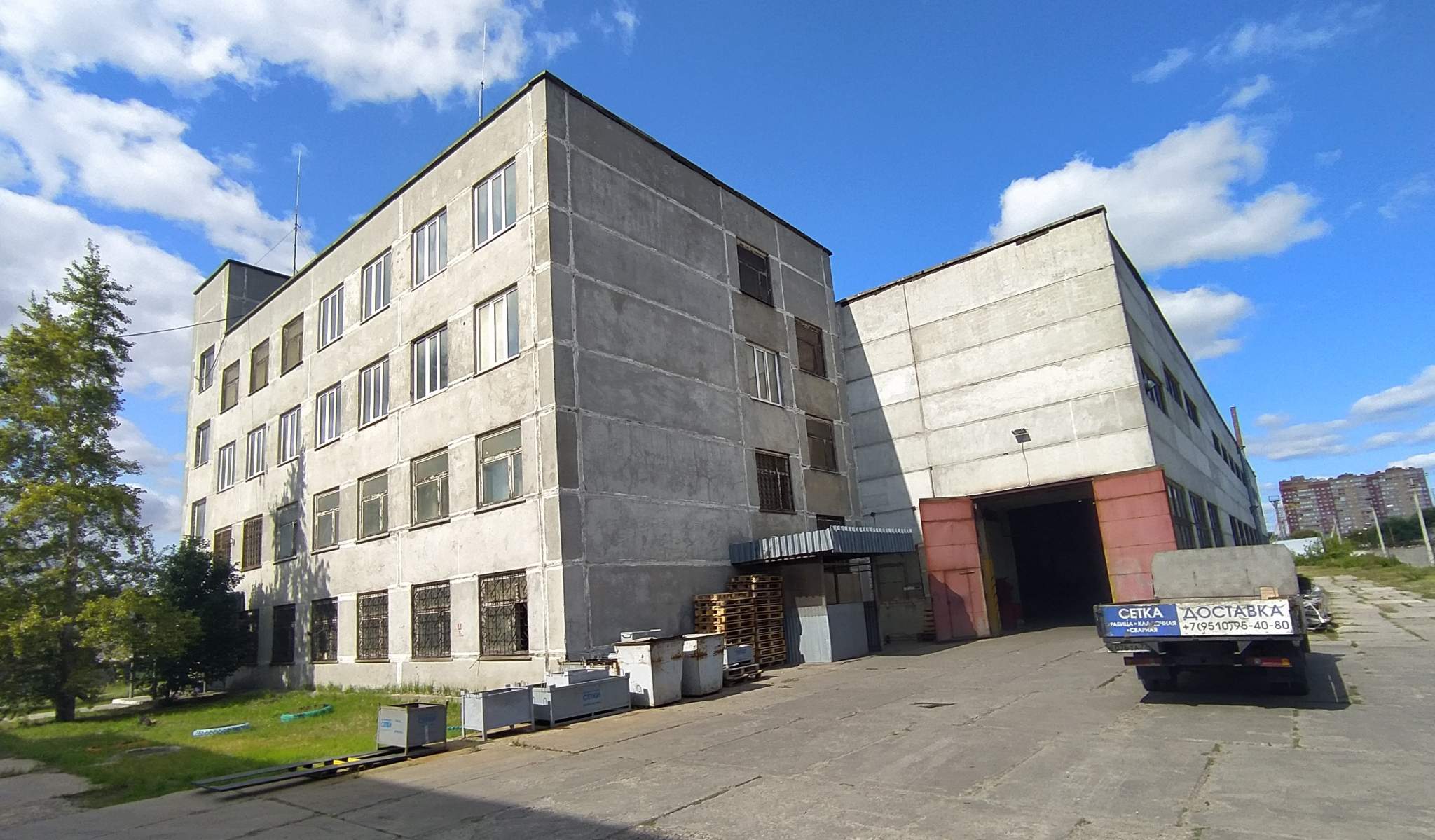 На территории производственной базы располагаются 2 административных здания 3-х и 4-х этажные, со свободными помещениями под офисы, склады или мелкое производство.