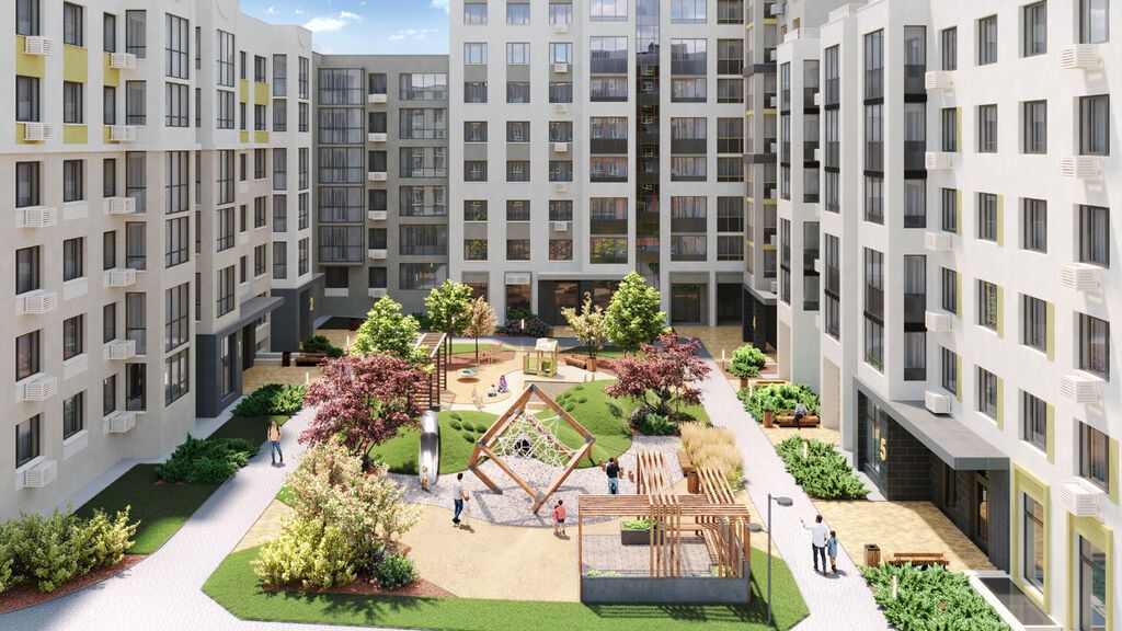 Дворы благоустроены с ландшафтным дизайном, зонами отдыха и спорта, детскими площадками и многоуровневым освещением. Пространства спроектированы для комфортного отдыха и безопасных прогулок жителей.